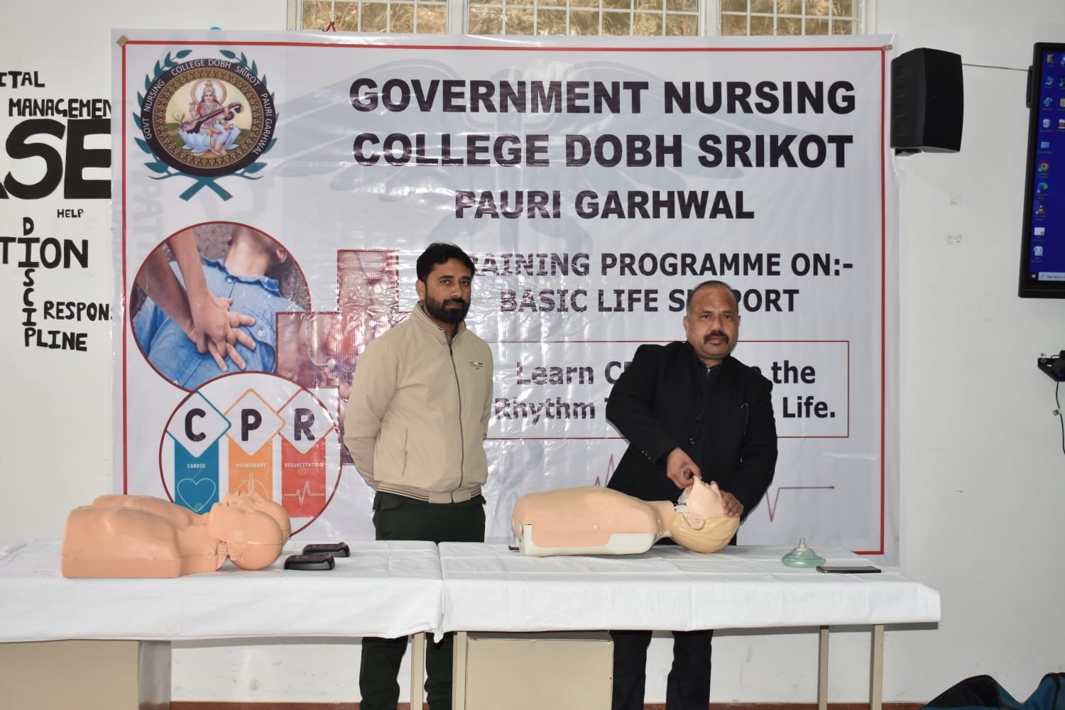 श्रीनगर: राजकीय मेडिकल कॉलेज श्रीनगर के एनेस्थिसिया विभाग द्वारा राजकीय नर्सिंग कॉलेज डोभ श्रीकोट पौड़ी में 65 छात्राओं एवं 10 स्टॉफ को मंगलवार को सीपीआर (कार्डियोपल्मोनरी रिससिटेशन) की ट्रेनिंग प्रदान की दी गई। जिसमें CPR देने की हैंड्स-ऑन अभ्यास भी करवाया गया। प्रदेश के माननीय चिकित्सा स्वास्थ्य एंव चिकित्सा शिक्षा मंत्री डॉ. धन सिंह रावत जी की विशेष पहल पर मेडिकल कालेज द्वारा हर संस्थानों में सीपीआर ट्रेनिंग दी जा रही है। अभी तक 2500 लोगों को उक्त ट्रेनिंग दी जा चुकी है। मेडिकल कालेज के प्राचार्य डॉ. सीएमएस रावत के निर्देशन में राजकीय नर्सिंग कॉलेज में एनेस्थीसिया विभाग के एचओडी एवं चिकित्सा अधीक्षक डॉ. अजेय विक्रम सिंह ने सीपीआर (कार्डियोपल्मोनरी रिससिटेशन) की ट्रेनिंग प्रदान की दी गई। उन्होनें छात्राओं को बताया कि सीपीआर देना हर किसी को आना चाहिए।