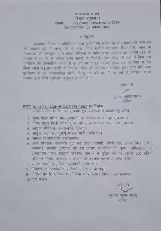 इस संबंध में परिवहन विभाग द्वारा अधिसूचना जारी कर दी गई है। अधिसूचना सचिव परिवहन श्री बृजेश कुमार संत द्वारा जारी की गई।मुख्यमंत्री पुष्कर सिंह धामी ने कहा कि केंद्र सरकार द्वारा हाल ही में 15 वर्ष पुराने कमर्शियल वाहनों की फिटनेस फीस में 10 गुना तक की वृद्धि की गई थी।प्रदेश की जनभावनाओं को देखते हुए राज्य सरकार ने यह निर्णय लिया है कि उत्तराखंड के वाहन स्वामियों पर इसका तात्कालिक बोझ नहीं डाला जाएगा।मुख्यमंत्री ने कहा कि उत्तराखंड सरकार आमजन के हितों को सर्वोपरि रखते हुए ऐसे निर्णय ले रही है, जिनसे जनता पर अनावश्यक आर्थिक बोझ न पड़े। उन्होंने कहा कि प्रदेश सरकार हमेशा जनता-जनार्दन की अपेक्षाओं के अनुरूप कार्य करती रहेगी।